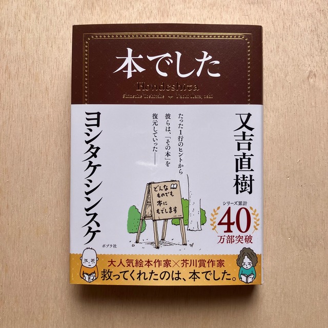 著者:又吉 直樹 ヨシタケ シンスケ 出版:ポプラ社 むかしむかし、村はずれにたっている空き家に、 いつからか、2人の男が住みつきました。 2人の男はある日、小さな看板を出しました。 バラバラになってしまった本や、 やぶれてしまった本でも、 特殊な技術で元に戻すというのです。 それどころか、ほんの1ページでも、1行だけでも タイトルだけでも、 ちょっとした手がかりさえあれば 元の本の形に復元できる、というのです。 村人たちが「本の復元依頼シート」を ポストに投函すると 本はどんどん復元されて――