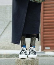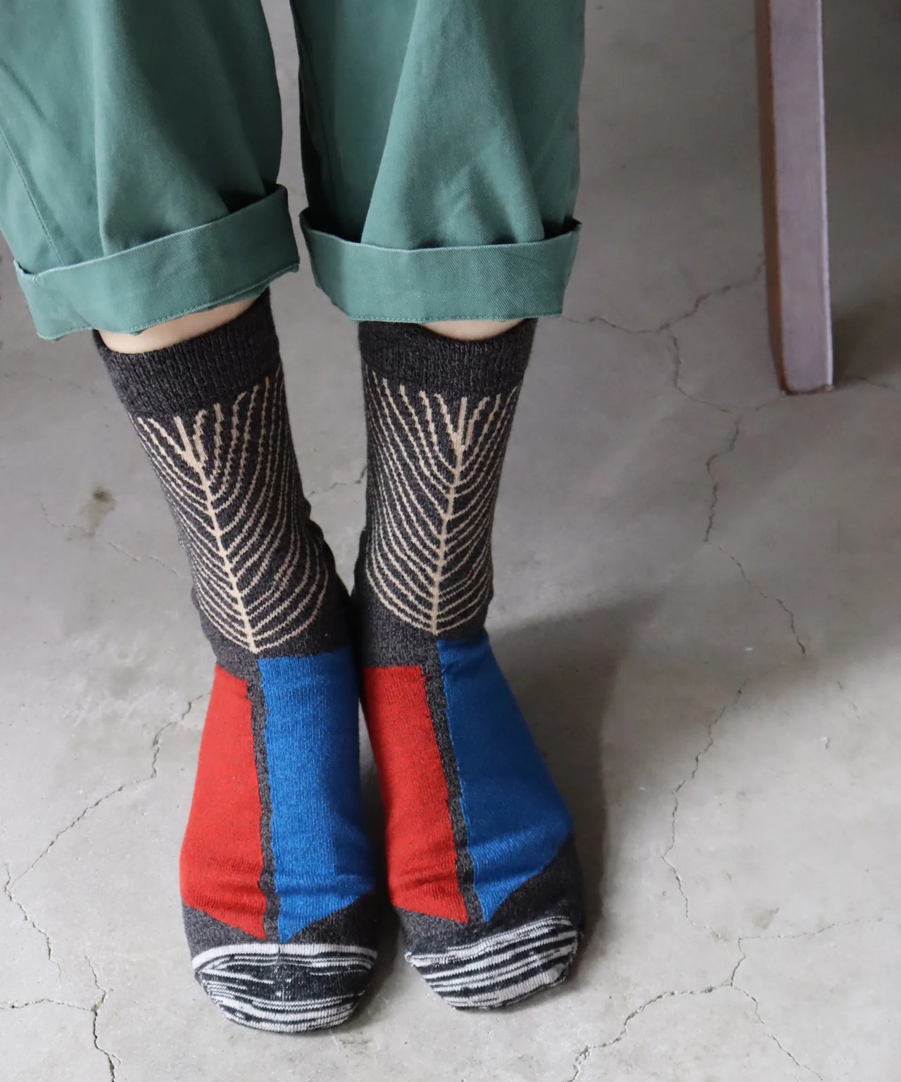 ラグのような温かみのあるミドルゲージ靴下です。フォークロア風の柄が、シンプルな装いにもさりげないアクセントを添えます。大胆な柄ですが、色味が落ち着いているので、合わせにくいといったことはなく、活用していただけると思います。