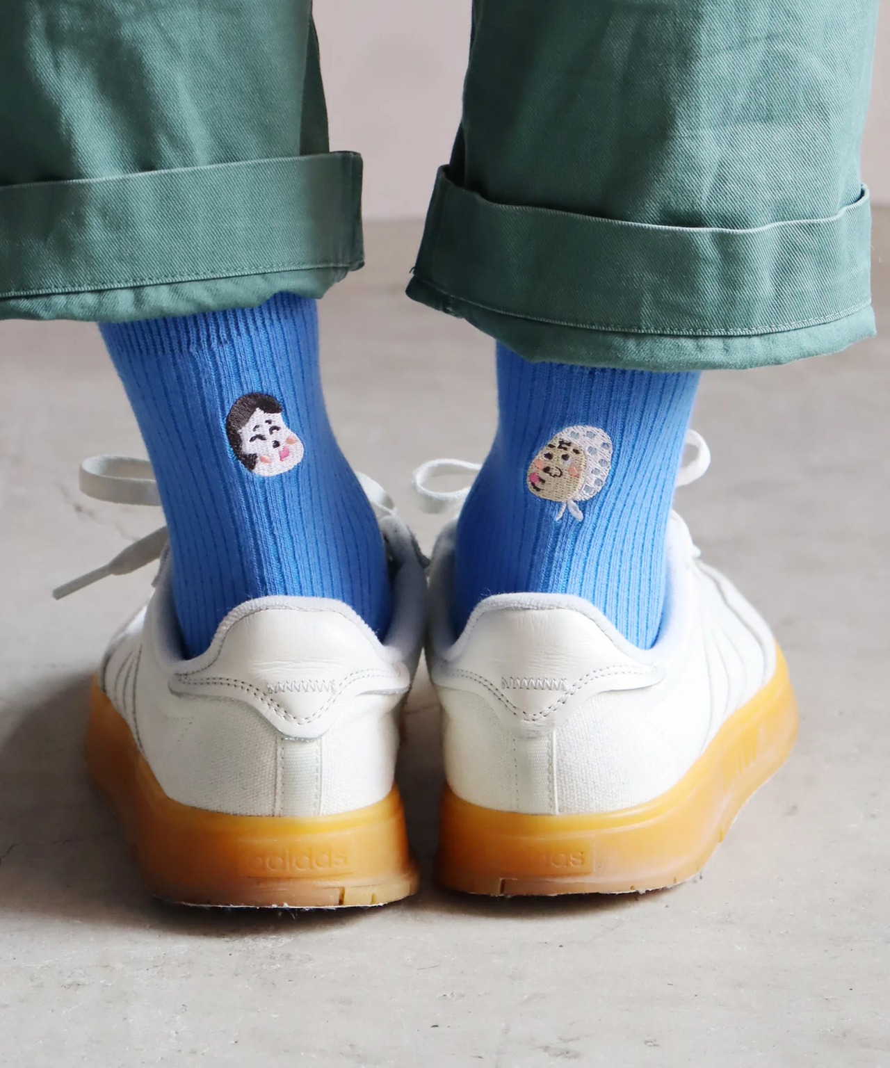 「お多福」と「ひょっとこ」、縁起の良い二人がバックに刺しゅうされた愉快な靴下です。