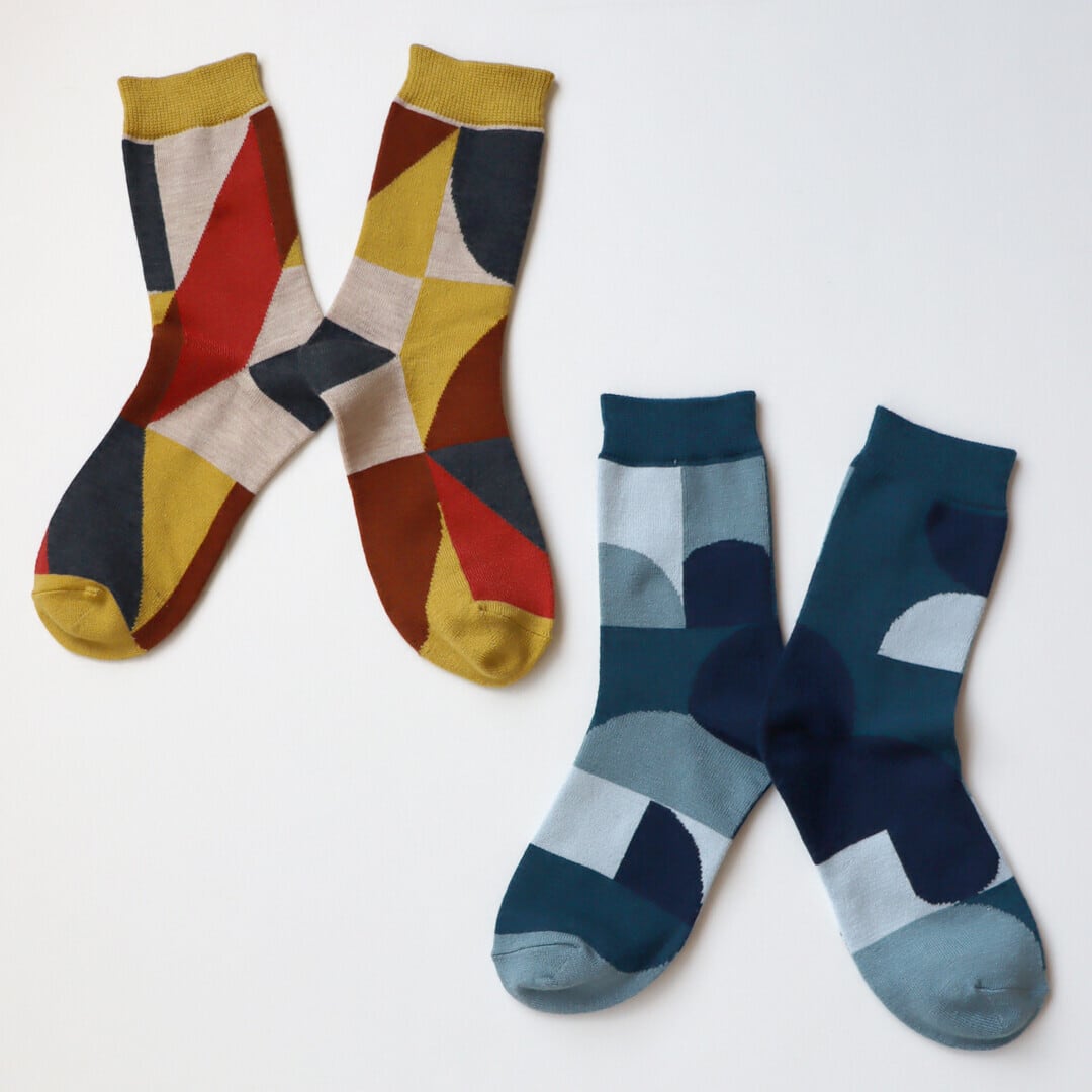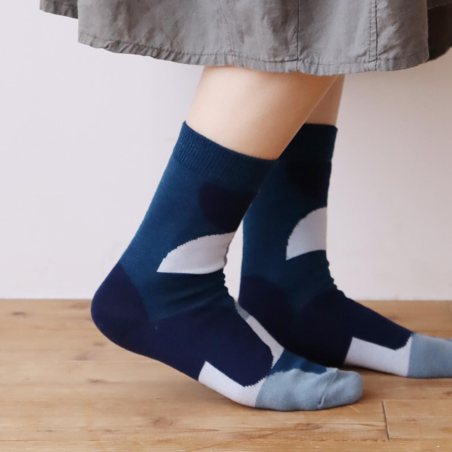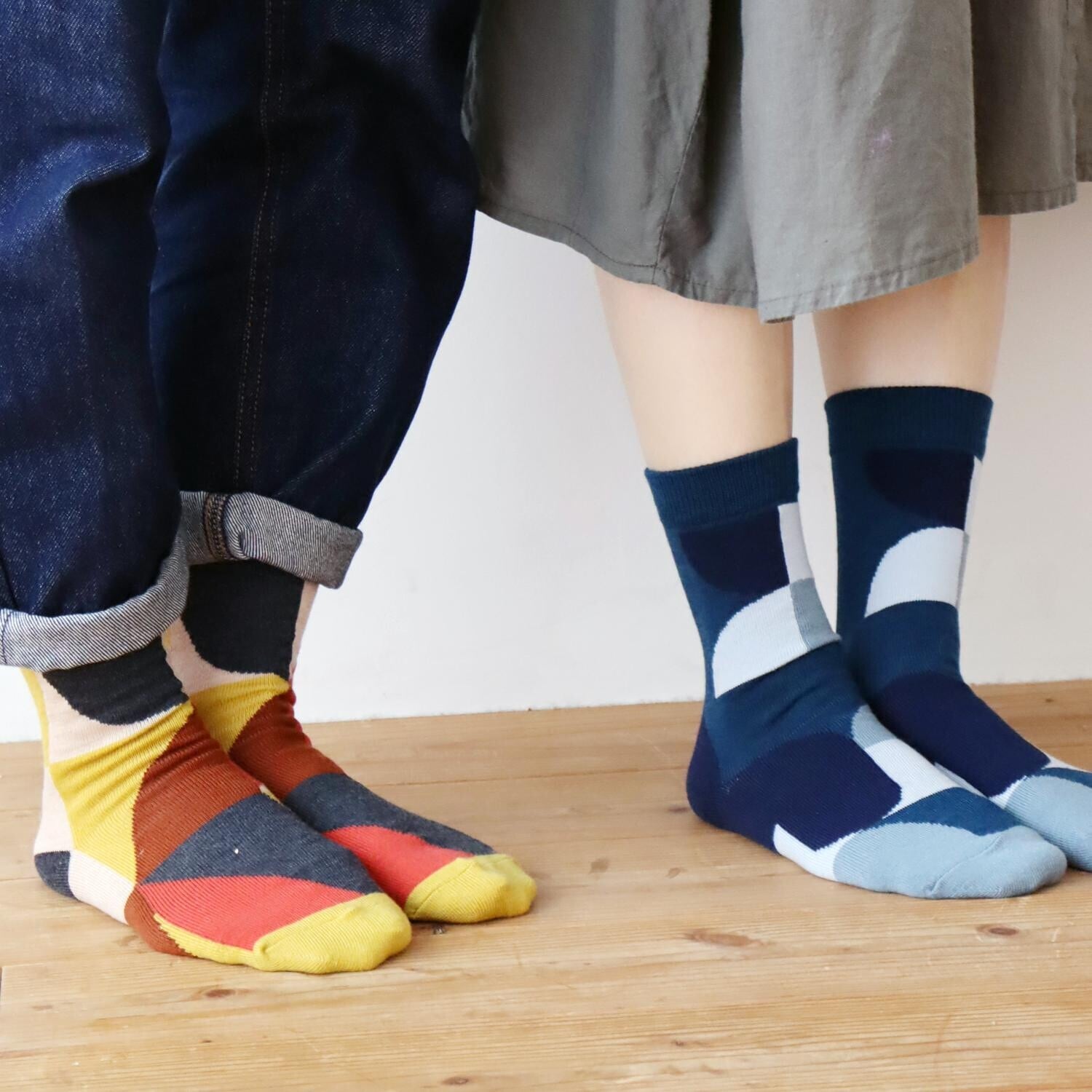 個性的で存在感があるのに普段使いもしやすい不思議な色と柄の靴下です。暖色系と寒色系の組み合わせもうれしいです。少しウールが入ったなめらかで上質な風合いも魅力的です。
